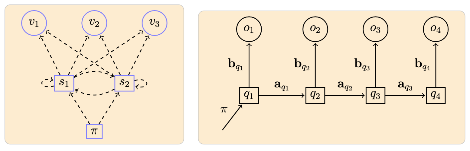 Example of a model with \(N = 2\) states \(\{s_1, s_2\}\) and \(M = 3\) symbols \(\{v_1, v_2, v_3\}\), and an associated observed sequence: