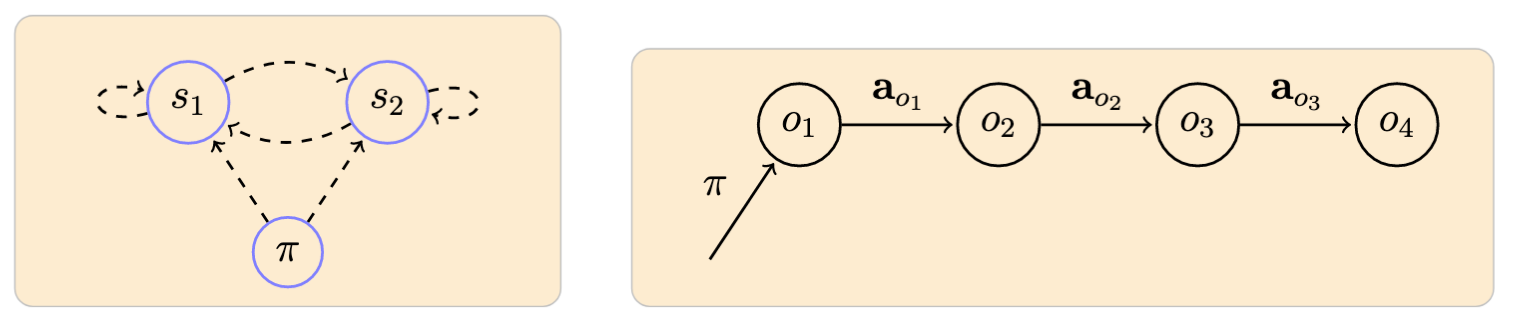 Example of a model with 2 observable symbols \(\{s_1, s_2\}\) and an associated observed sequence: