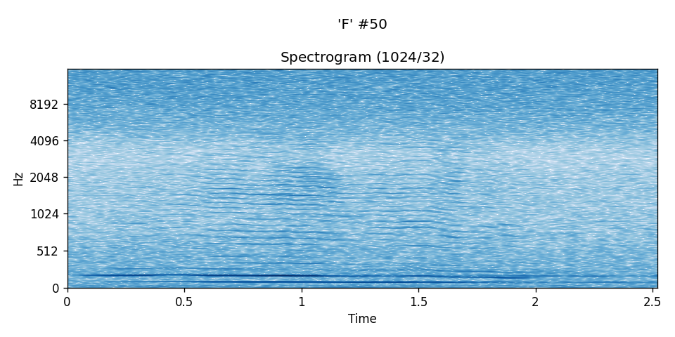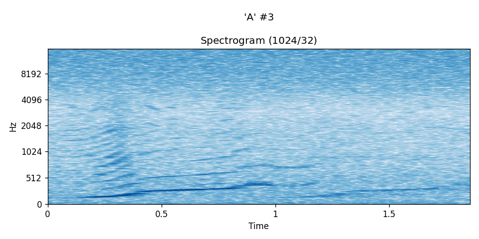 A DFT of window size 1024 and offset 32 was used in each of the spectrograms below. Time axis is in seconds.