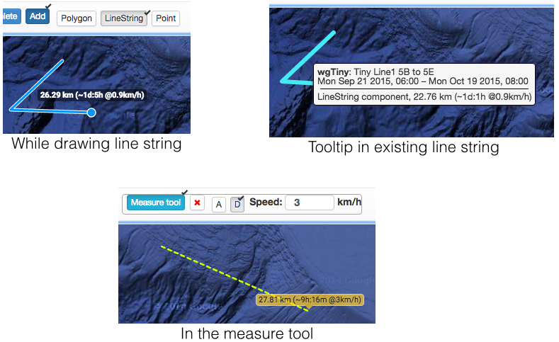 - time is shown along with the distance for both existing line-strings (on mouse-over) and while drawing new ones for a token. The speed is taken from an interim hard-coded platform-speed association