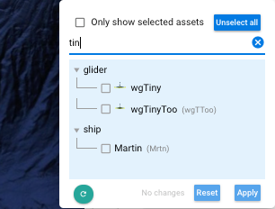 This in general will show any current selection you have along with all other assets available from the tracking database. You can use the checkbox at the top to only see your current selection, which is handy in case you need to unselect some.