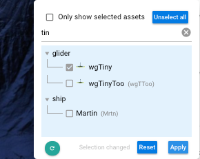 Once you are happy with your applied selection, press Escape, or click outside of corresponding box, to close the asset selection dropdown.