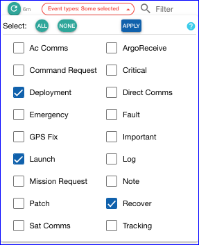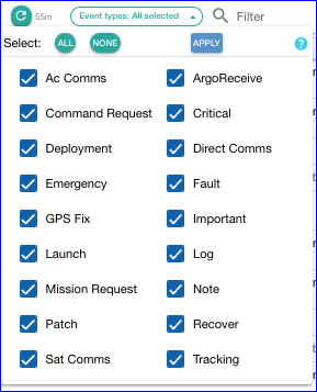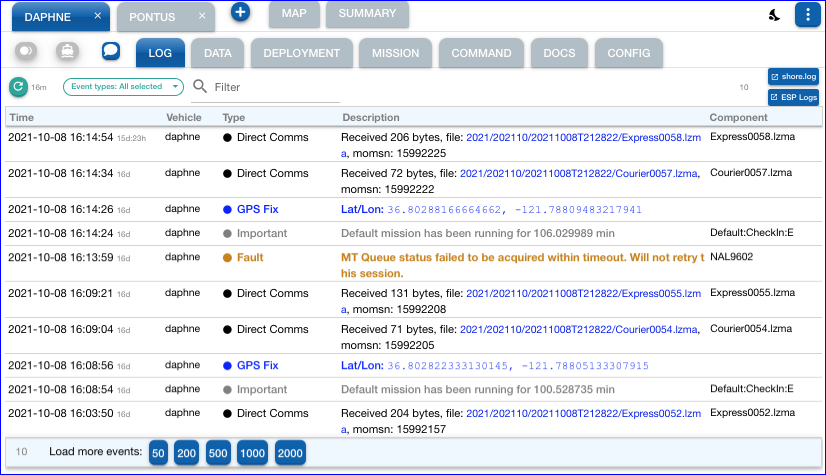 The buttons at the bottom of the table allow quickly loading more events from the backend and according to the current event type selection.
