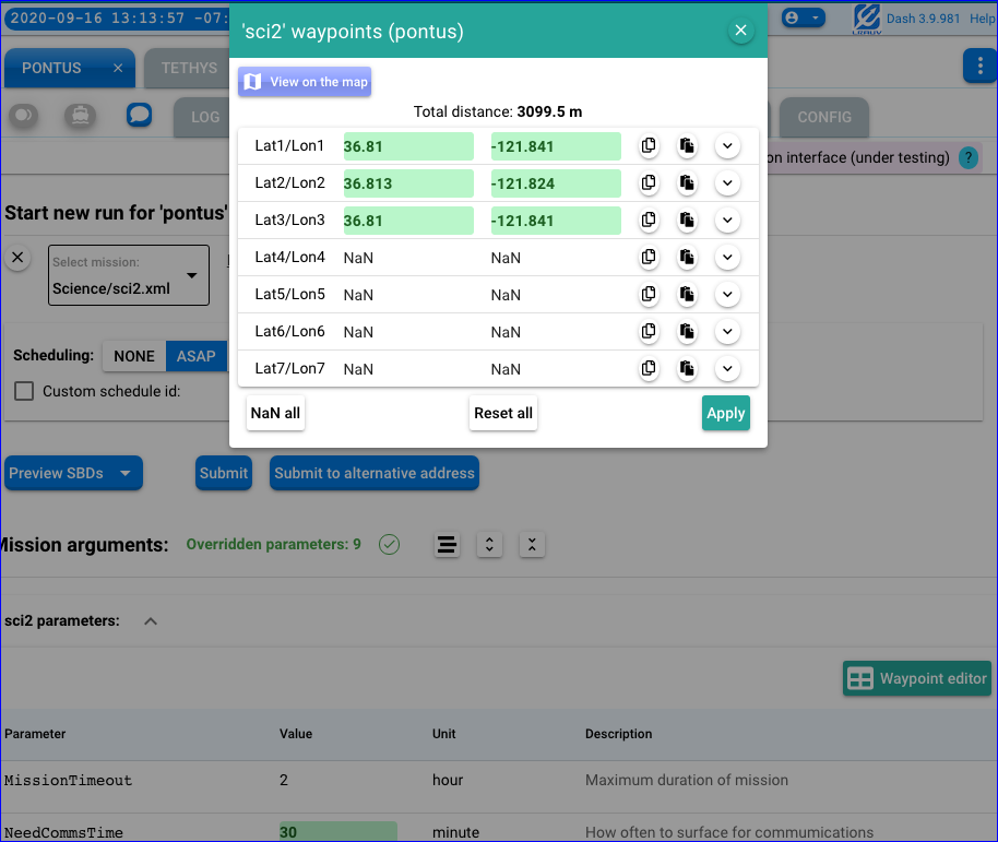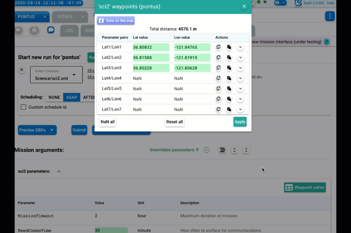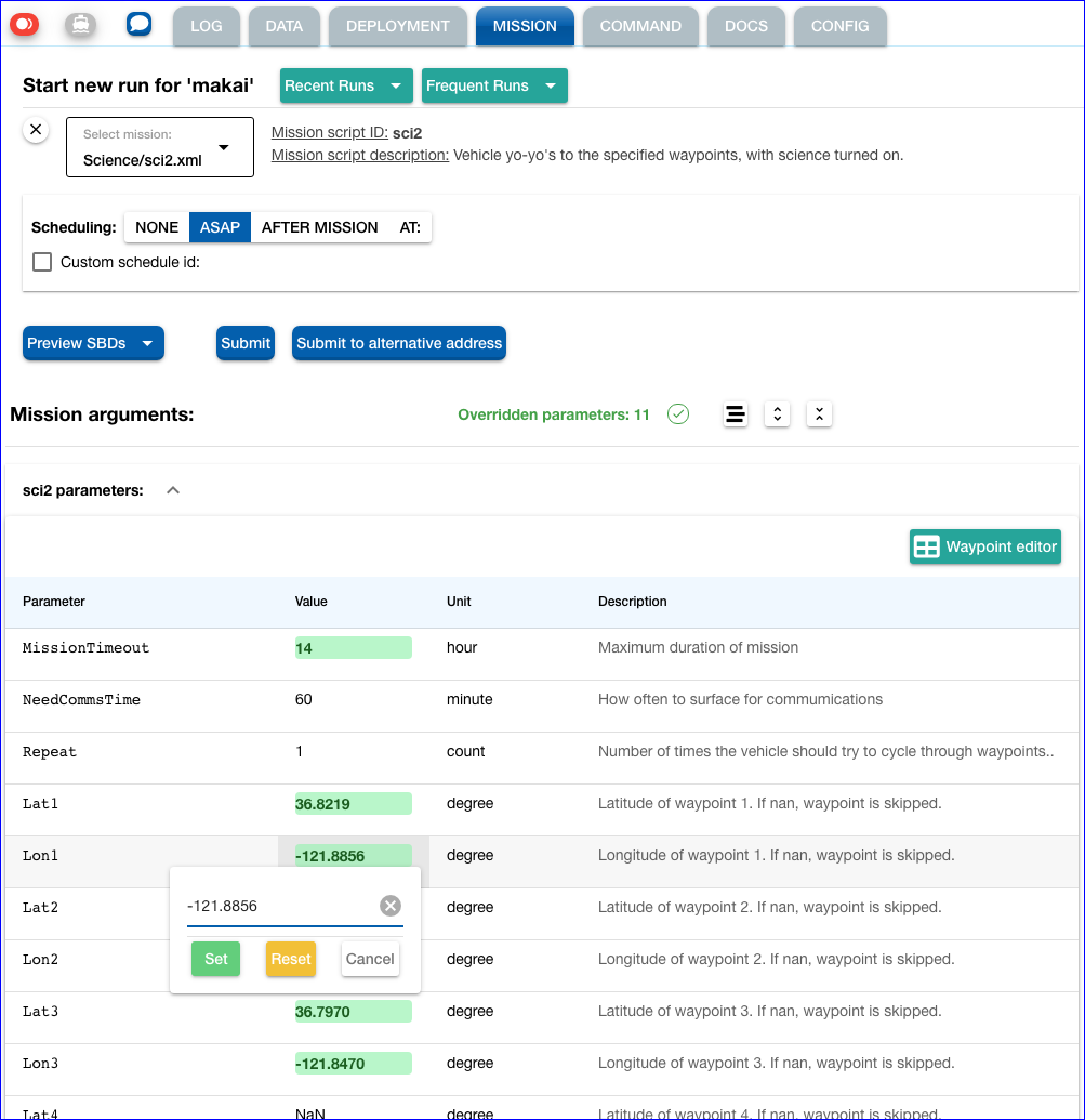 degreeas unit. In the screenshot above, these are: Lat1/Lon1, Lat2/Lon2, etc. (The recognition of such parameters uses the same logic as that used for the display of waypoint trajectories in regular operations.) Click this button to open the new "smart" editor as described below. -