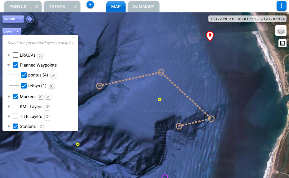 The usual 'Layers' dropdown on the map will include a "Planned Waypoints" section with the planned missions, one per vehicle.