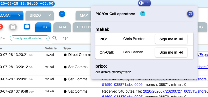 During operations, this will formally show who are currently the PIC and the On-Call operators for the selected vehicles having an ongoing deployment.