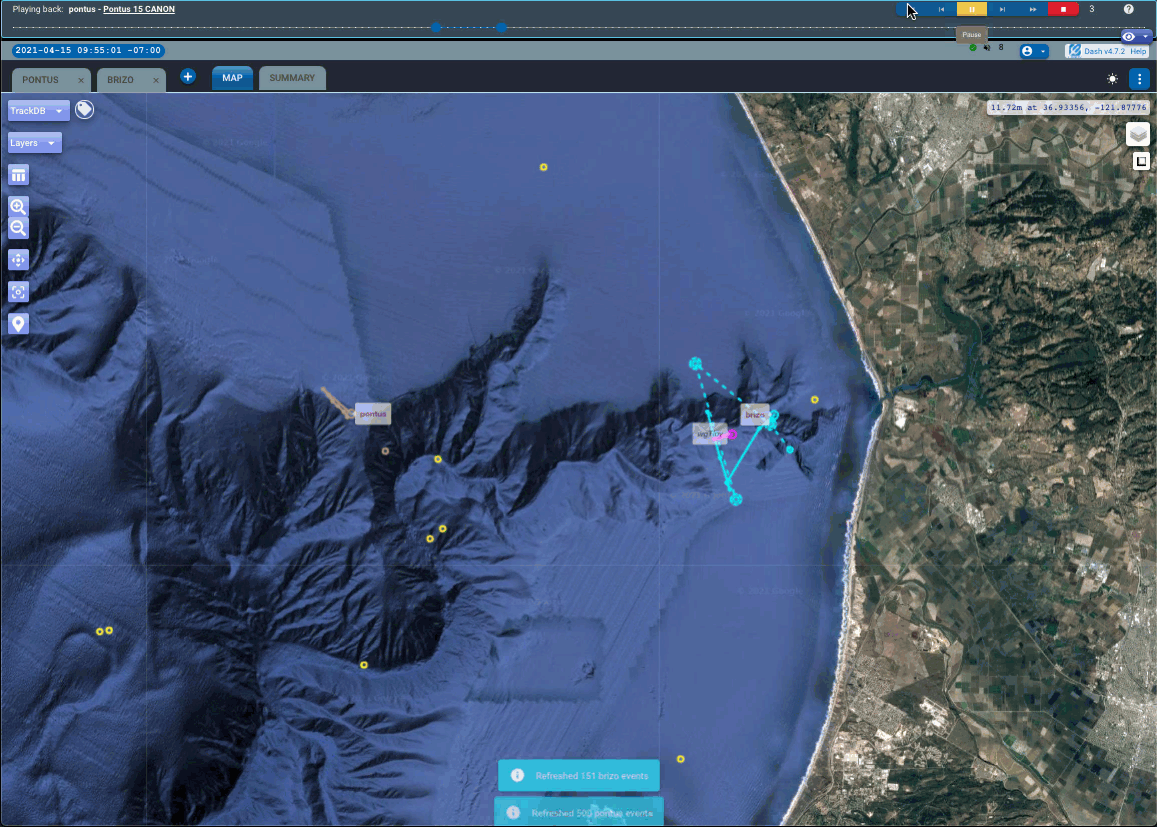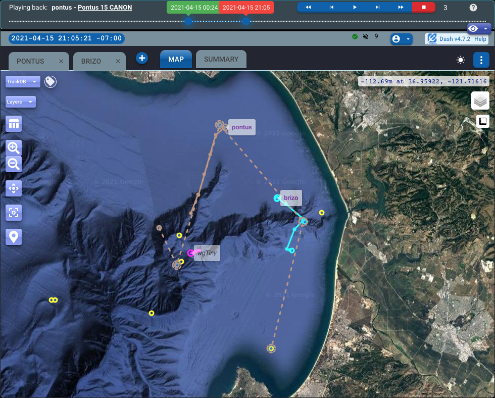 Even though you start the playback mode for a given vehicle deployment, you can also have other LRAUV and tracking database assets selected as normally done in the application. The playback mode will recreate the history of events also for those other assets.