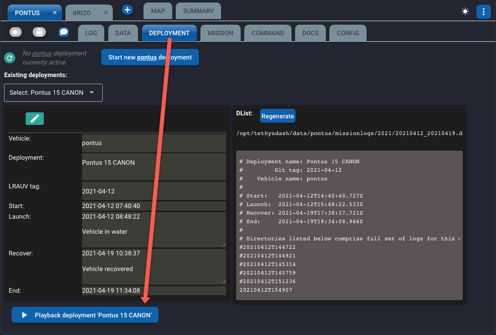 - Under the Deployment tab, select the desired deployment and click the 'Playback deployment' button.